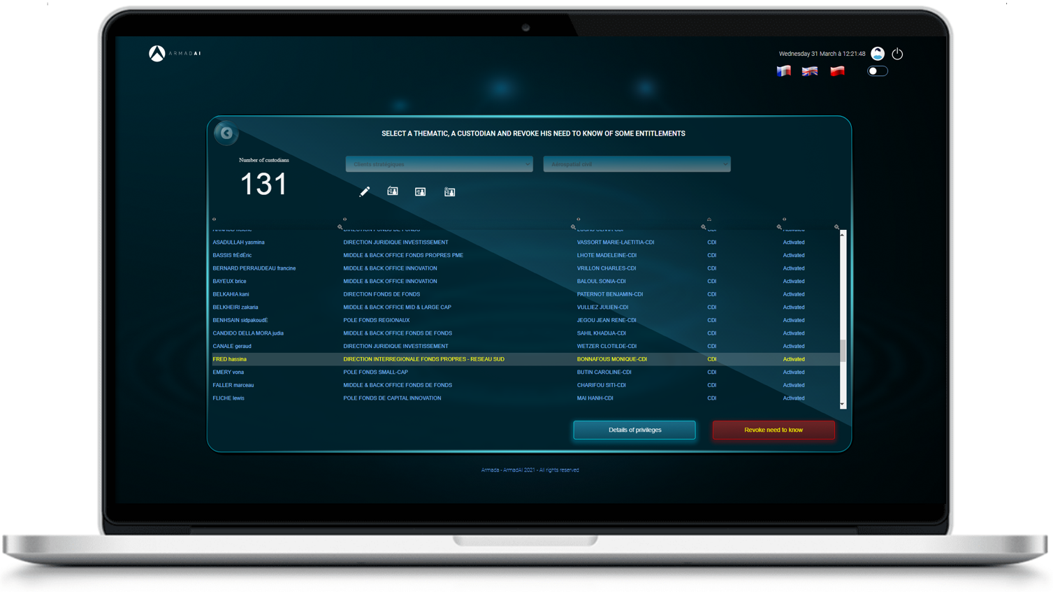 ArmadAI offers an administration service making it possible to manage the need to know in a discreet way to avoid fanning the location of vital data with a whole set of managers and custodians who sometimes do not even have knowledge of the extent of their privileges.