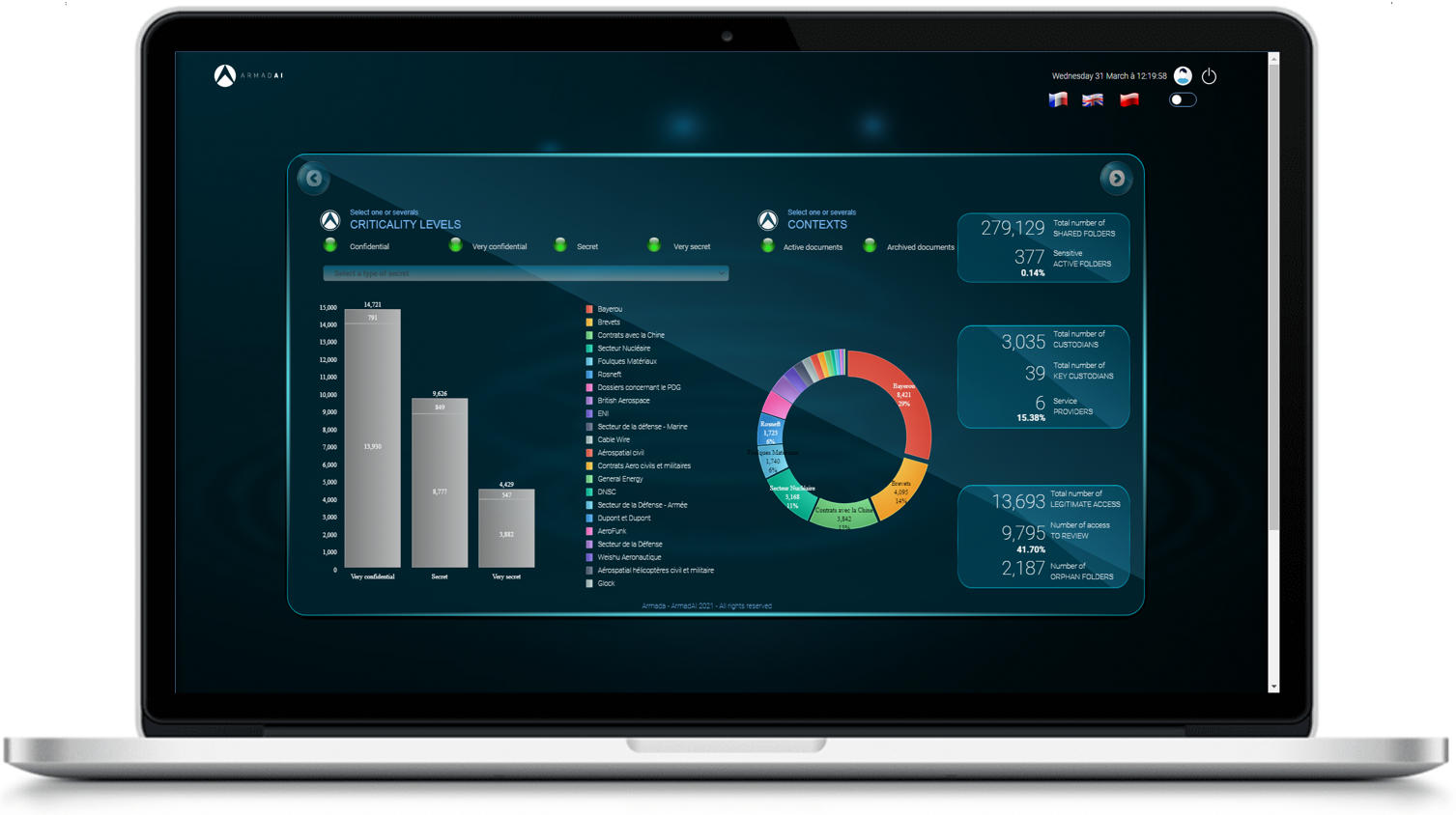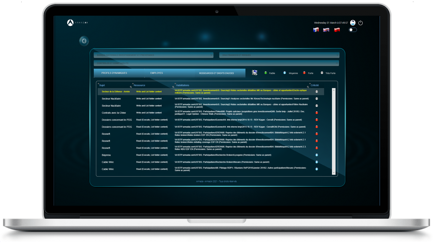 ArmadAI simplifies the need to know management by exposing the nature of the vital information accessible to users: corporate strategy, commercial contracts, strategic clients, patents, national defense, activities in certain countries potentially or recently subject to an embargo, etc. ...